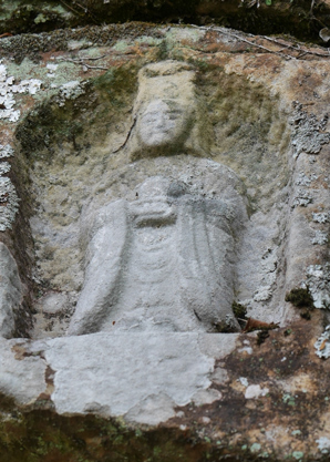 久山町内のマンションや新築住宅が立ち並ぶ、路地の突き当たり、丘の麓の岩肌に磨崖仏があります。