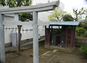 ←↓ 道路そばの鳥居の奥に、祠があ