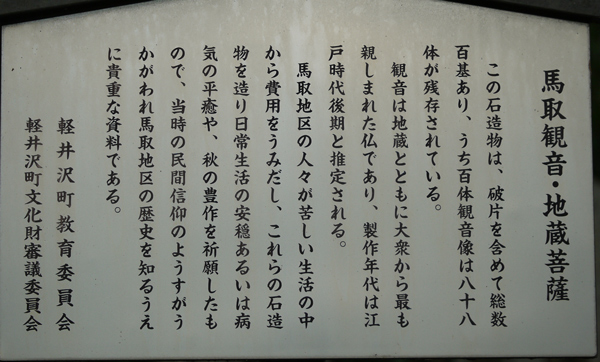 「馬取の石仏群」は、軽井沢町馬取地区の小高い丘の上にあり、石段を上がった薬師堂の隣には、主に百体観音像や地蔵菩薩などが祀られています。
